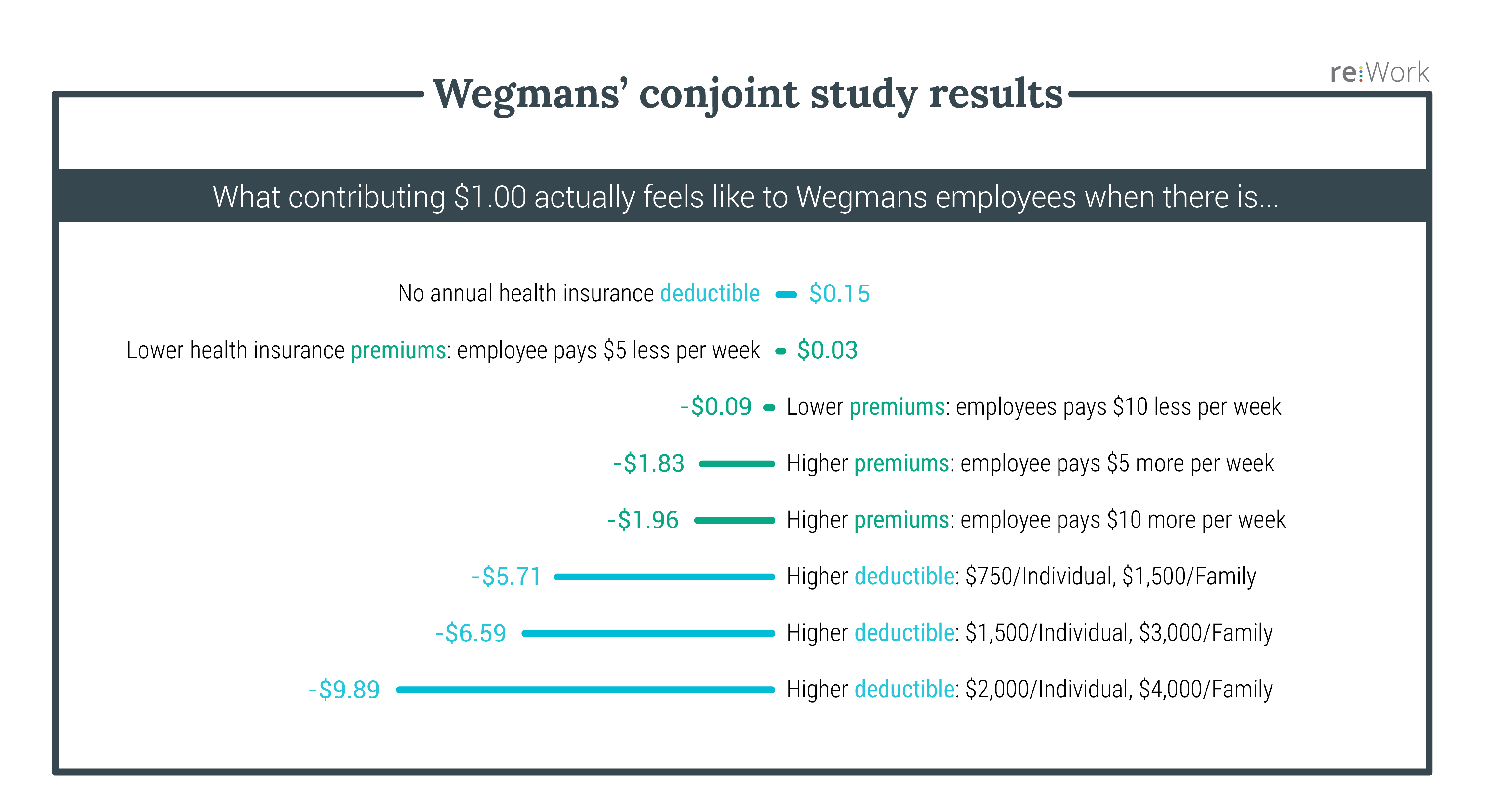 Оба блока вопросов показали, что сотрудники воспринимают медицинское страхование как решающий фактор при выборе работодателя и продолжении трудовой деятельности в компании. В частности, совместный анализ показал, что предложение даже базового медицинского обслуживания для сотрудников, которые в настоящее время не имеют права на получение услуги, будет приводить к значительному увеличению ценности медицинского страхования для сотрудников. Анализ показал, что инвестиции в размере 107 $ на одного сотрудника, не имеющего право на получение услуги, будут стоить 1,5 млн. $ для компании, но по ощущениям сотрудников это будет стоить 32,5 млн. $. Неожиданно Wegmans открыл, что зарплата была отнесена в конец обоих списков с точки зрения ценности для сотрудников. Еще один интересный вывод заключался в том, что в вопросе выбора между низким вычетом и низкой страховой премией, сотрудники готовы платить больше, чтобы иметь меньше ответственности.