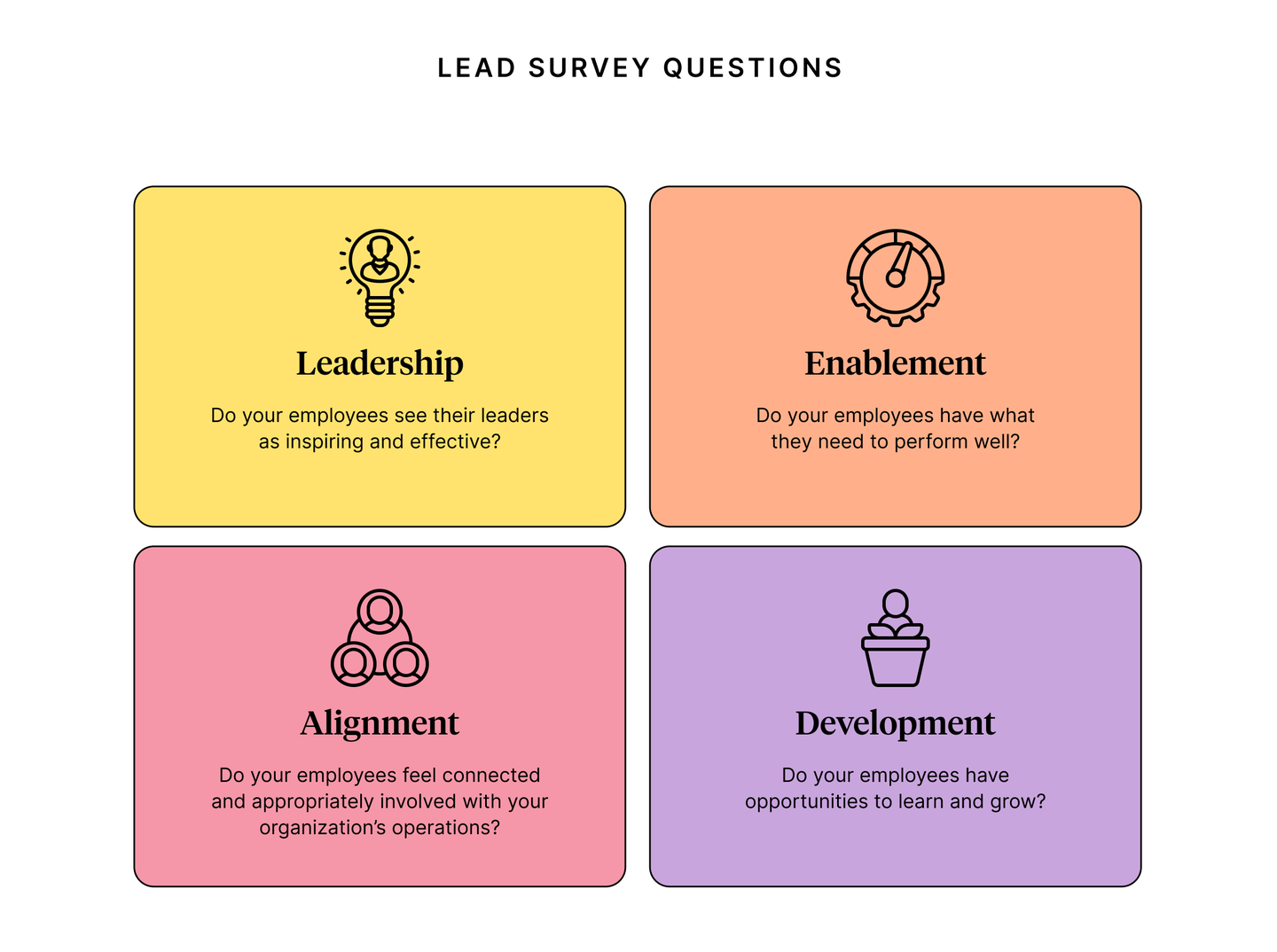 После нашего индекса вовлеченности мы задаем вопросы о четырех основных факторах, которые стимулируют вовлеченность сотрудников (LEAD):